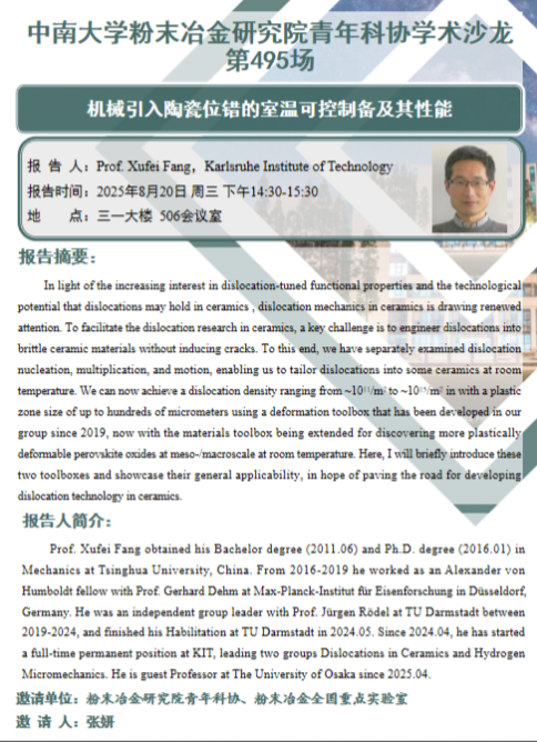 Prof. Xufei Fang obtained his Bachelor degree (2011.06) and Ph.D. degree (2016.0l)inMechanics at Tsinghua University, China. From 2016-2019 he worked as an Alexander vonHumboldt fellow with Prof, Gerhard Dehm at Max-Planck-Institut fur Eisenforschung in DusseldorfGermany. He was an independent group leader with Prof. Jurgen Rodel at TU Darmstadt between2019-2024, and fimished his Habilitation at TU Dammstadt in 2024.05. $ince 2024.04, he has starteda full-time permanent position at KIT, leading two groups Dislocations in Ceramics and HydrogerMicromechanics, He is guest Professor at The University of Osaka since 2025.04.