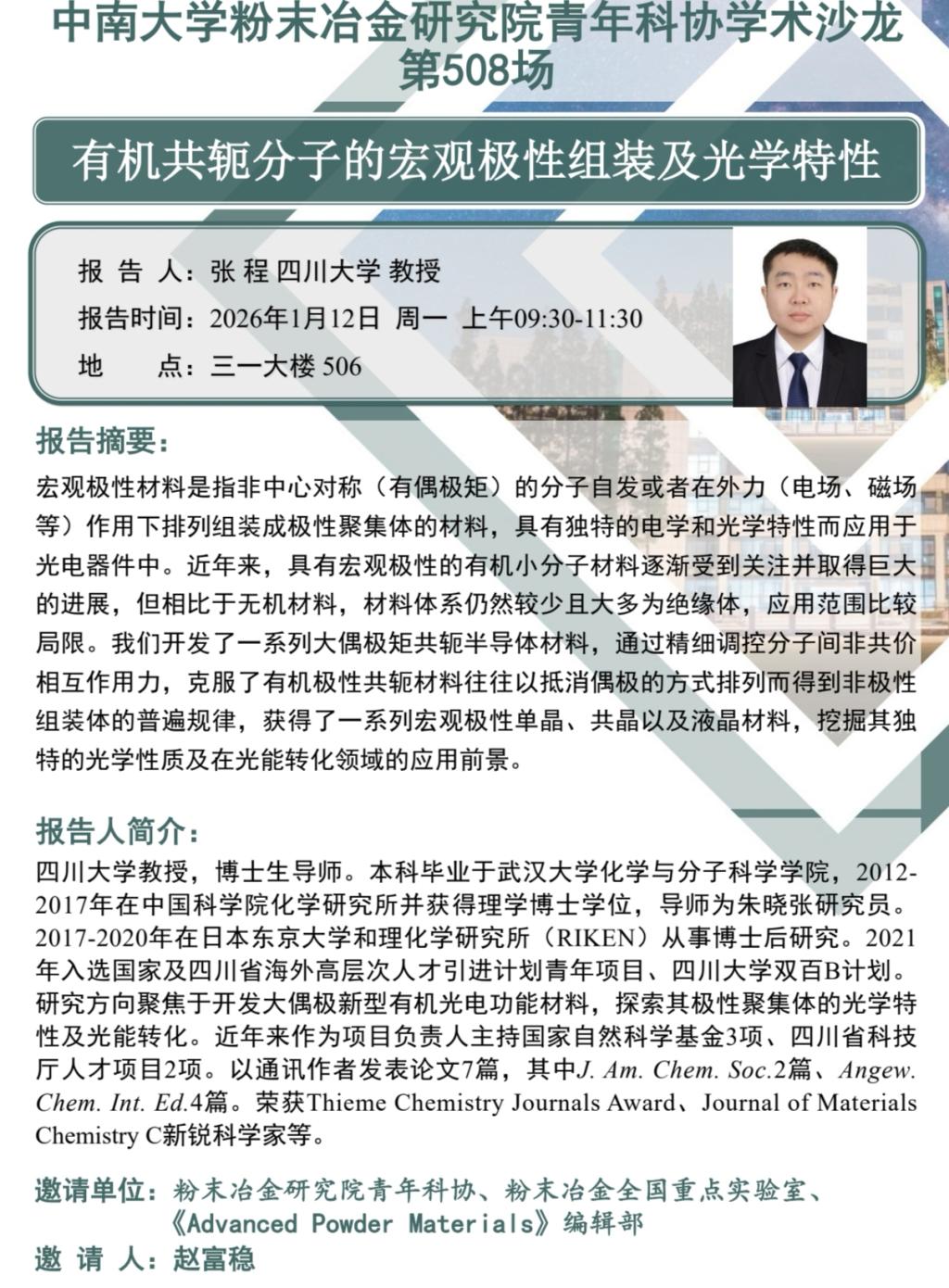 青年科协沙龙(第508场):有机共轭分子的宏观极性组装及光学特性