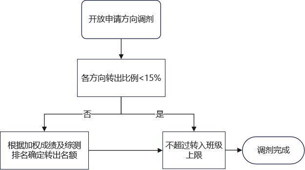 5. 在大三上学期开始的前两周,学生可申请进行一次方向调整,通过学籍异动调换行政班级的方式实现。为保障教学安排的有序性,转换比例不超过原方向人数的15%,当超出指标数时,按加权平均成绩排名和综测成绩排名确定优先顺序;各专业方向接收转专业学生后,原则上每班不超过30人。调剂流程如图3所示。