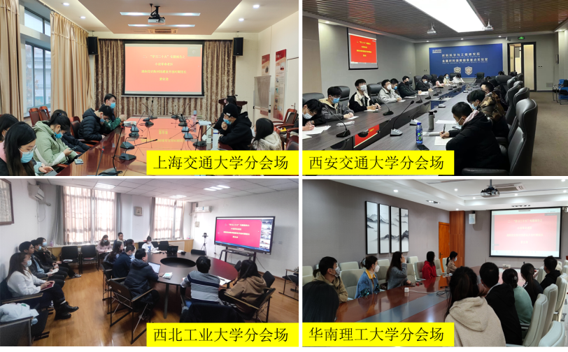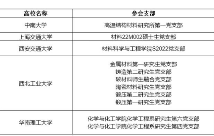 院长刘咏,上海交通大学材料科学与工程学院学生党建负责人许耀心,西安交通大学材料科学与工程学院党委副书记魏炜,西北工业大学材料学院党委副书记蔡利剑,华南理工大学化学与化工学院党委副书记刘才刚及五所高校11个研究生党支部的150余名党员参加了活动(表1)。活动分为二十大专题报告与二十大学习分享会两大部分,五个高校都设立了线下分会场。