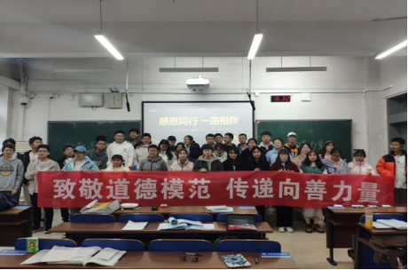 最后,同学们集体在横幅下留念。本次活动深入学习了习近平总书记在加强道德建设方面对于青年大学生的一系列期待与要求,让各班学子深深牢记道德模范的标兵意义。