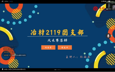 下半场冶材2104团支部、冶材2119团支部、冶材2120团支部、冶材2122团支部、冶材2123团支部五个支部带来了优秀的答辩,评委老师就疫情期间如何更好地开展团日活动进行了提问,冶材2119班团支书结合本班情况以及学校要求等方面进行了陈述。