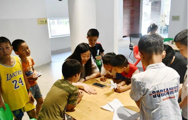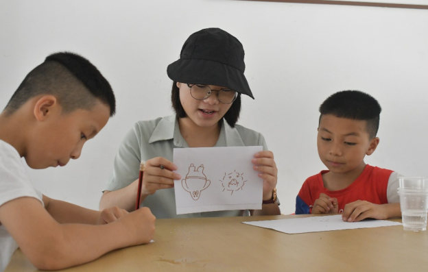 下午2点,支教团前往支教地点。当地部分孩子对上一任支教团的离去表示不舍与留恋,支教团的魏彤昕和杨济华同学迅速对孩子们的情绪进行安慰。其余同学则是对已在支教教室的同学们进行了解。交流一段时间后,支教团发现在场的同学们年龄不同、爱好不同、性格不同,如果进行大班统一教学可能会非常困难,学生的满意度也可能会比较低,因此支教团临时决定将下午的教学内容改为每个支教成员负责至少五个同学进行针对性教学。李恬恬同学和指导老师林钰杰指导一部分同学进行画画;杨济华同学继续安抚一些孩子的情绪;魏彤昕同学教孩子们折纸飞机、千纸鹤等一系列手工艺品并指导孩子们唱歌;齐杰琪和钟征余同学负责对孩子们进行暑假作业的答疑解惑。