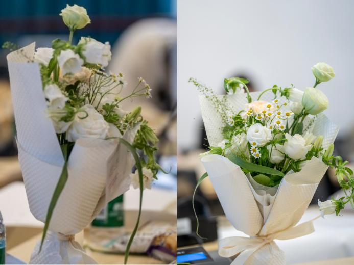 随后,山有嘉卉花艺社的李念、张宇梁、孙丽盈同学向大家展示了花枝挑选、枝叶修剪、色彩搭配的技巧,以及花束内衬的选择与包装方法。他们巧妙地运用各种技巧,将一朵朵花包装成一件件精美的艺术品。