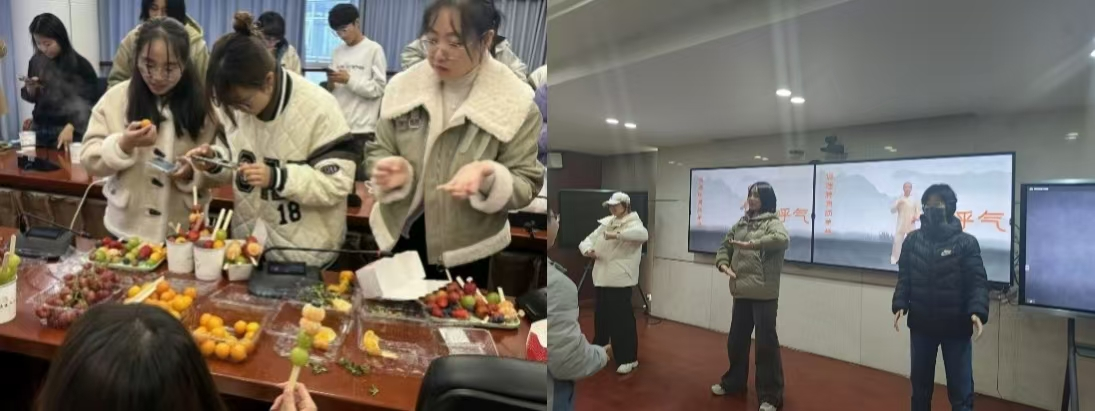 并且为让同学们在寒冷季节能感受到生活的温度,一场线下暖冬活动于12月7日下午在三一大楼409、506活动室内举办。409活动室内,同学们共同制作冰糖葫芦,用这种甜蜜的方式庆祝冬天的到来。而506活动室内,同学们在八段锦养生操的体验过程中体验了传统健身古法的魅力,同时也在深冬养生课堂的学习过程中,学会了如何调理自身体质,让自己健康地度过寒冷的冬季。