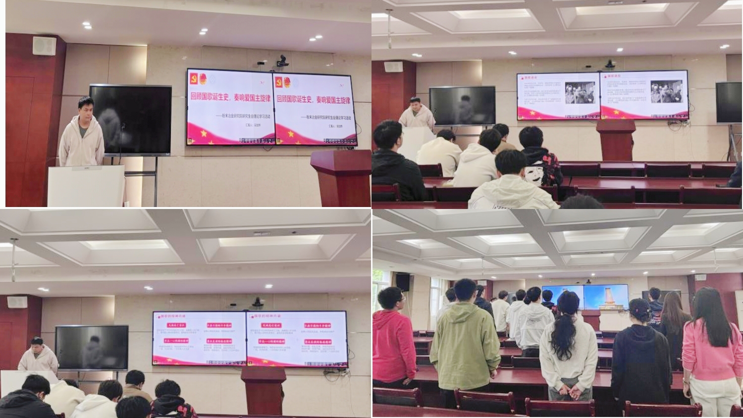 研究生会在三一大楼409举办了以“回顾国歌诞生史,奏响爱国主旋律”为主题的理论学习活动,活动通过详实的历史资料与生动的讲解,重温《义勇军进行曲》从抗日战歌到国家象征的峥嵘历程,激励青年学子传承红色基因,勇担时代使命。院研究生会主席团成员、各部门部长及副部长参与本次活动,活动由办公室副部长吴加烨同学主持。