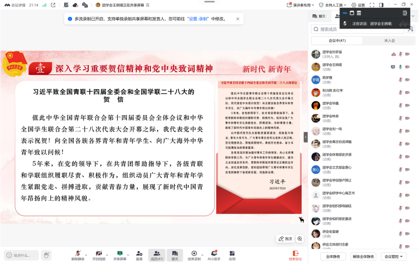 学生会、研究生会通过线上平台,组织召开专题学习会学习贯彻习近平总书记重要贺信精神和党中央致词精神,传达学习全国青联十四届全委会和全国学联二十八大精神。分团委书记彭仕亨、常务副书记文天骐,学生会、研究生会全体学生干部参会。