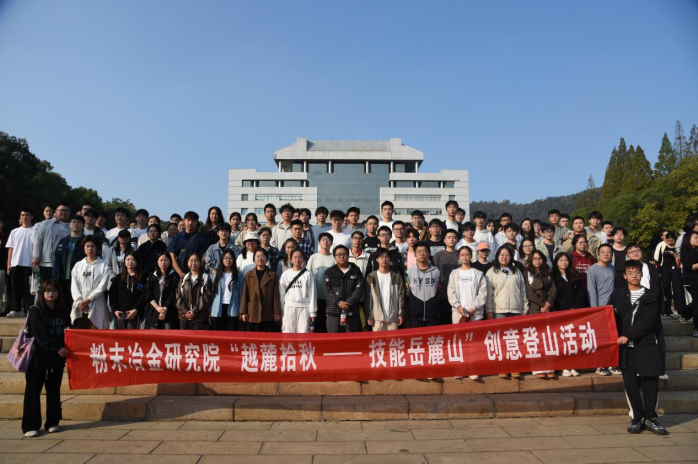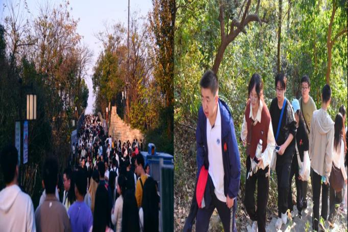 师生在岳麓山校区图书馆前集结完毕。随着“趁青春,去登山”的激昂口号响起,本次“越麓拾秋——技能岳麓山”登山活动正式拉开帷幕。