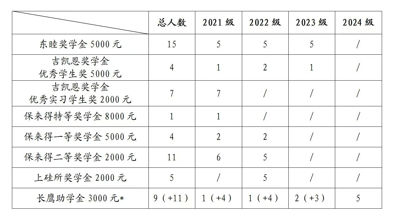 注:获上硅所奖学金的同学需参加上海硅酸盐研究所大学生冬令营;标“*”的为助学金(今年长鹰助学金评定原则调整为一年一评,往年已获该助学金本科生按获评当年规定执行)。最终奖项名额与等级以企业与学院沟通为准。