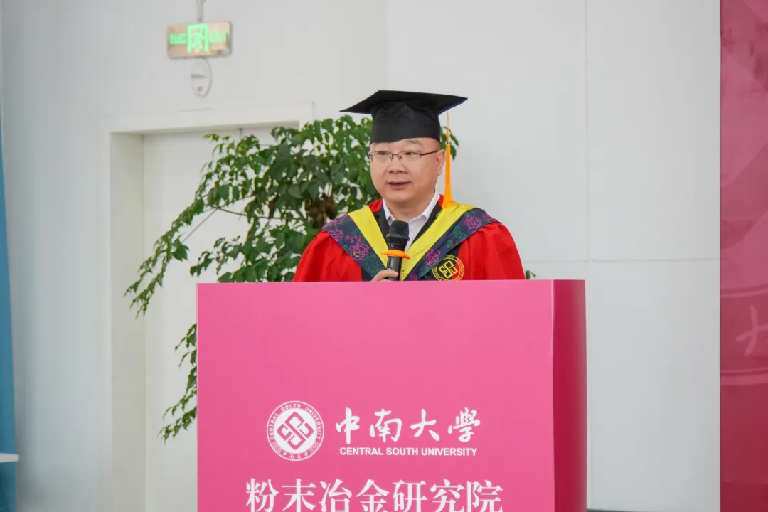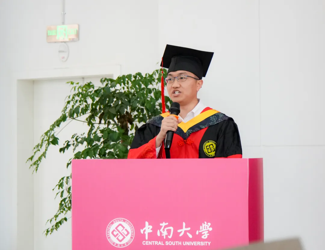 随后,研究生代表曾晨同学发言。他讲述了自己与材料的故事和为国防事业添砖加瓦的憧憬,毕业之后他即将得偿所愿,以一名科研工作者的身份奔赴中国工程物理研究院工作。他许诺:“在新的工作岗位上,我将继续践行将自身所学奉献给祖国国防事业的初心,做惊天动地事,做隐姓埋名人。”