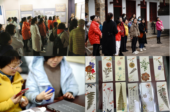 女职工一行来到了饰性斋,体验古法拓印与柳叶书签的制作过程。敷、刷、贴、蘸、拓……这项2019年被列为非遗的传统技艺,让女职工在感悟中华传统文化的手工实践中,传承工匠精神,增强文化自信。