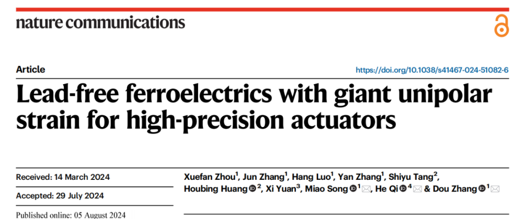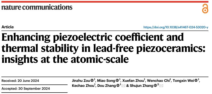 张斗教授团队近期针对KNN和BNT基无铅压电陶瓷体系中长期存在的关键科学问题开展实验与理论研究,取得系列突破,于2024年8月、10月连续在《Nature Communications》发表相关工作。