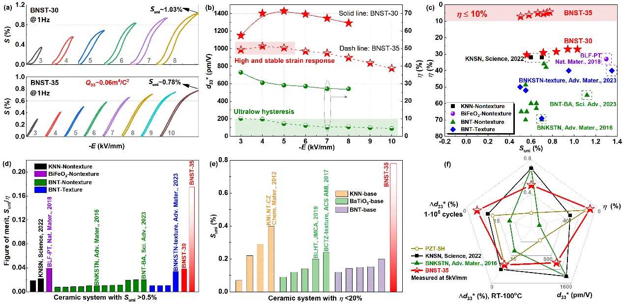 图1:BNST陶瓷的单极应变性能:在畴工程与缺陷工程作用下,BNST-30的Suni在8kV/mm下达1.03%,迟滞为27%;BNST-35的Suni在10kV/mm下达0.78%,迟滞为4.4%;BNST-35的d33*在3~5kV/mm低场下维持在1000pm/V,迟滞小于10%。