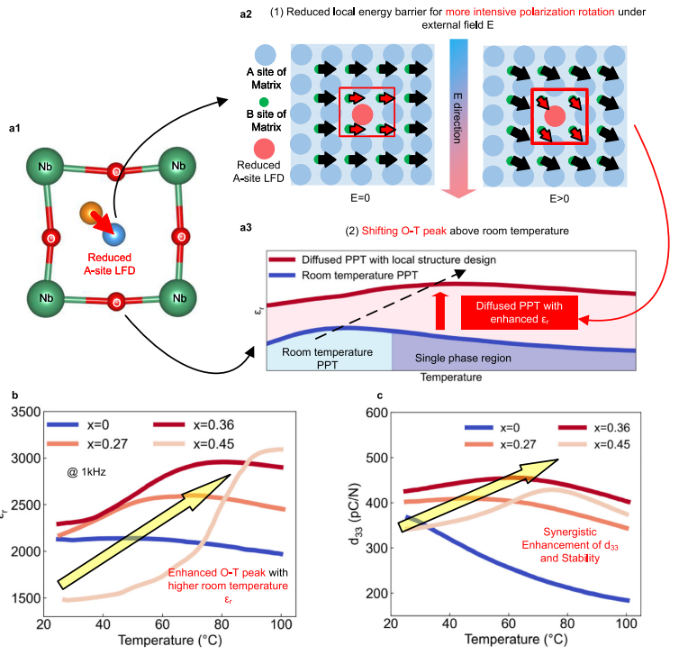 成果介绍:该研究首先从理论上证明了隐藏在平均PPB结构中两种不同的原子尺度的局域铁电畸变(LFD)。此外,还阐明了这些LFD如何与PPB相互作用,提出了原子尺度的物理图像。基于这种原子尺度的物理理解,进一步构建解决无铅压电陶瓷实际性能挑战的策略。该策略通过调控掺杂位点的LFD,平坦极化翻转势垒的同时构建弥散性的相转变。该方法实现了优异的~430pC/N的d33,并在室温到100℃范围实现了优异的温度稳定性(△d33~7%),在压电传感领域具备应用潜力。通过退火进一步优化,温度稳定的范围能进一步提高到150°C(△d33~8%),同时保持~380pC/N的高d33,可与经典的温度稳定的铅基压电陶瓷相媲美。该研究为解决无铅压电陶瓷中高压电系数和温度稳定性不足之间难以兼得的难题建立了一个框架。