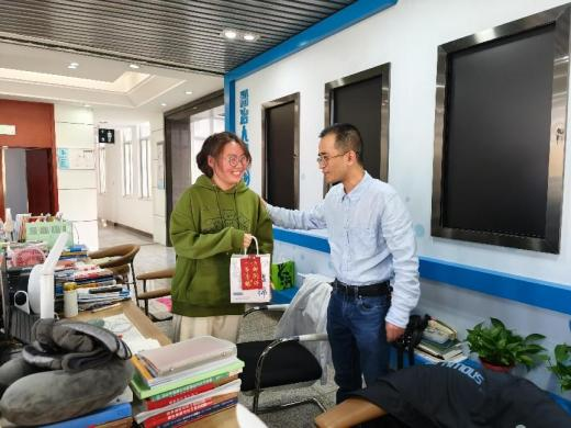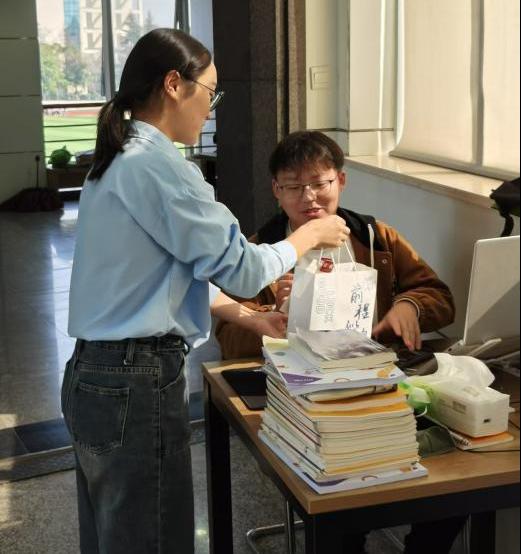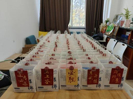 为正在冲刺复习的考研学子们精心准备了心意满满的考研祝福礼包,加油鸭日历、解忧小木鱼等十件礼品,寓意十全十美,满载着对学子们的关心与祝福。党委副书记黄曦、辅导员林钰杰以及各位班长亲手将祝福大礼包分发给同学们。黄曦副书记还鼓励同学们要全力以赴地复习,并表示学院将始终关注并支持考研学子们。