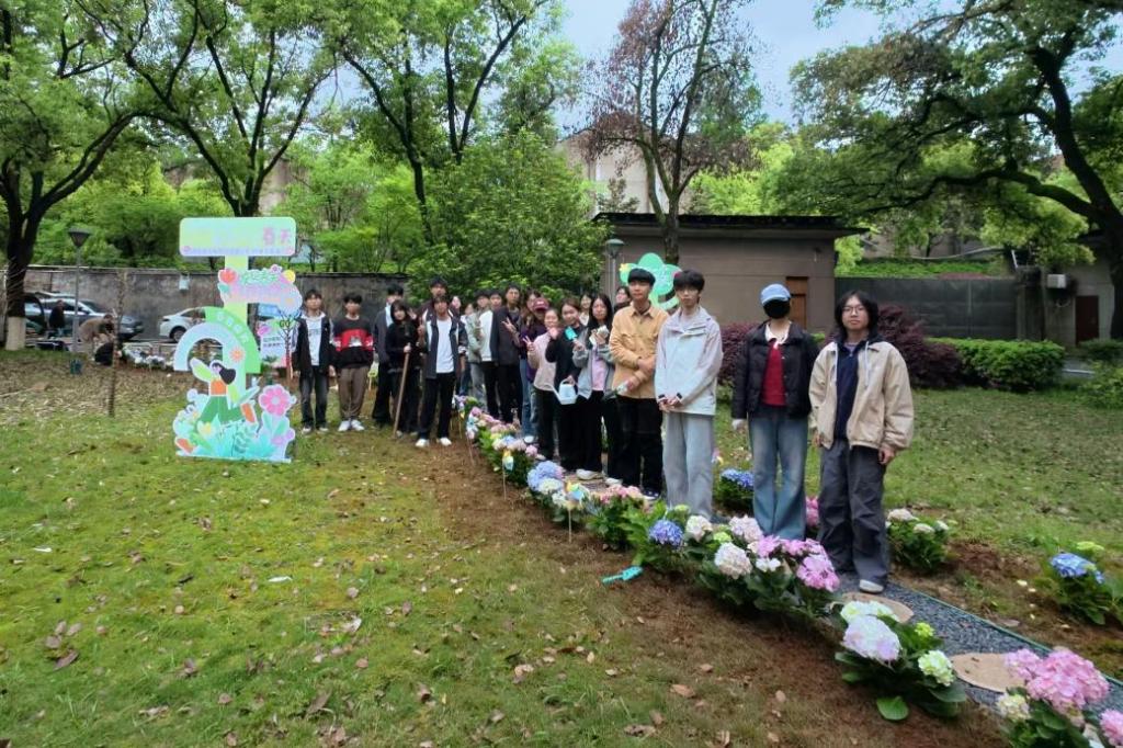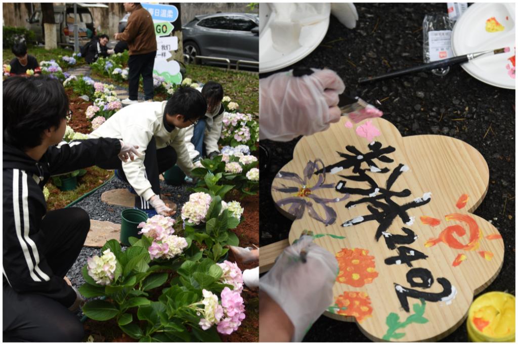 在黄书记的鼓励与引导下,同学们有序领取活动物资,前往划定区域开展创作。大家分工协作,默契配合,将一株株花苗栽入土壤,并将班级特色与春日愿景融合,设计、绘制出专属班牌插在花圃之中。同学们以创意装饰土地、用劳动浇灌希望,在创作中展现青春活力,活动现场氛围轻松热烈。
