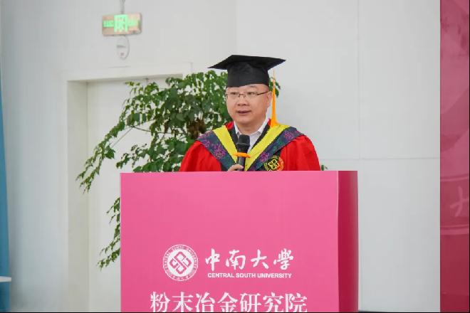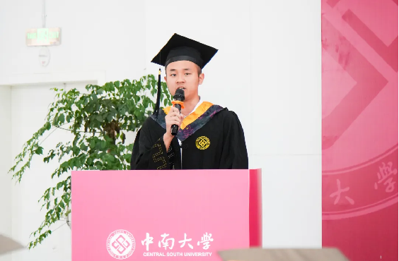 随后,研究生代表曾晨同学发言。他讲述了自己与材料的故事和为国防事业添砖加瓦的憧憬,毕业之后他即将得偿所愿,以一名科研工作者的身份奔赴中国工程物理研究院工作。他许诺:“在新的工作岗位上,我将继续践行将自身所学奉献给祖国国防事业的初心,做惊天动地事,做隐姓埋名人。”